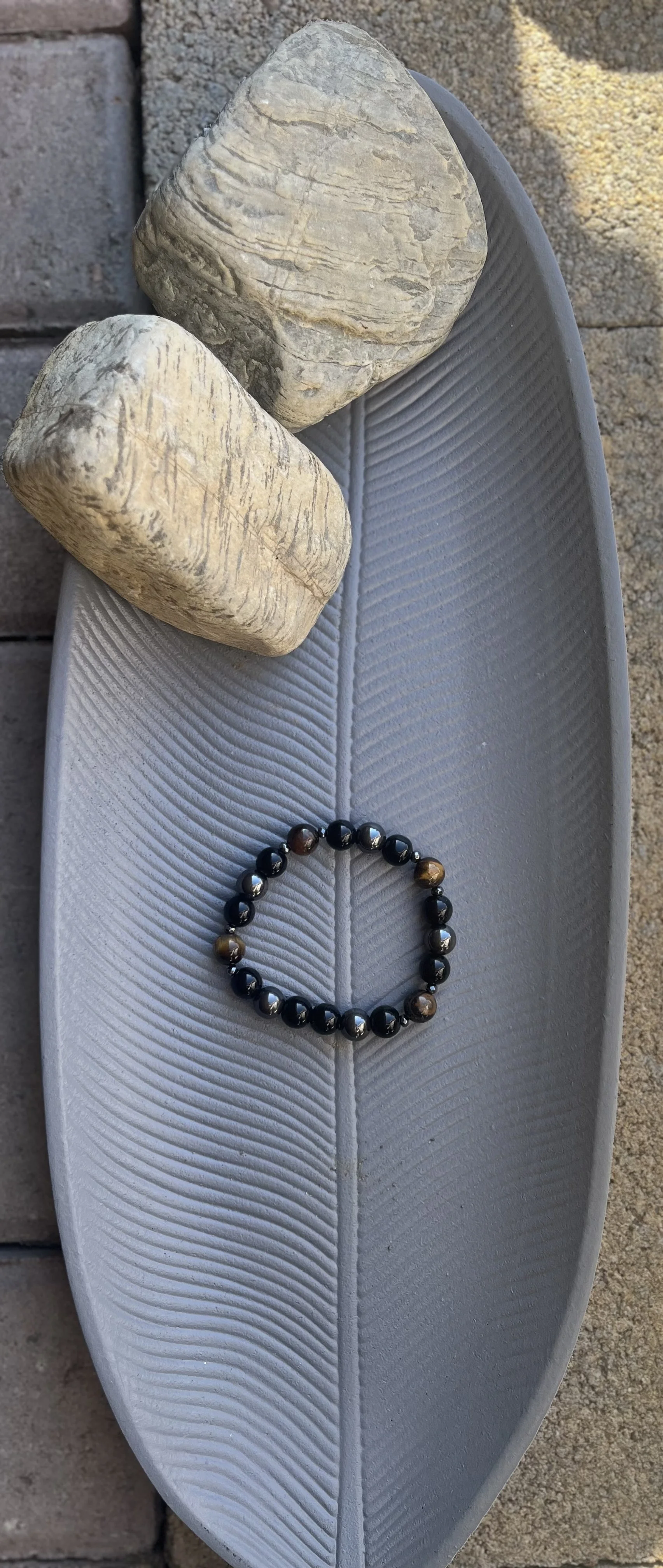 10mm bracelet featuring hematite, obsidian, and tiger eye exudes a refined yet earthy elegance, blending sleek metallic tones with rich natural textures. The hematite beads lend a polished, modern edge with their gunmetal sheen, while obsidian adds depth and mystique through its glossy black surface. Tiger eye introduces warmth and movement, its golden-brown bands catching the light with a mesmerizing shimmer. Together, these stones create a harmonious balance of grounding, protection, and empowerment—perfect for someone who appreciates handcrafted luxury with spiritual resonance. Ideal for pairing with minimalist fashion or layered boho looks, this bracelet is both a statement piece and a subtle talisman. Can be used unisex.