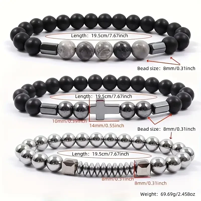 This handcrafted stack combines matte onyx, marbled gray jasper, and polished hematite beads, accented with sleek stainless-steel details and a modern cross charm. Designed for the man who values strength and style, each bracelet layers texture. Perfect alone or stacked together, this set captures confidence with a touch of understated luxury — the signature Lis Jewelz look. Sophisticated. Bold. Effortlessly cool. Can be used unisex.