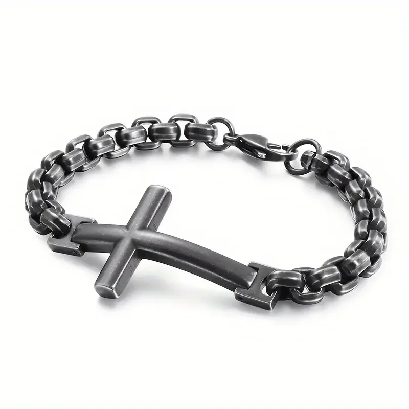 Embrace strength and style with this striking men’s bracelet. Crafted in dark stainless steel, its bold box-link chain and sleek horizontal cross create a modern symbol of faith and confidence. The matte finish adds an edgy sophistication, making it the perfect piece for everyday wear or statement layering. Designed for the man who values purpose, power, and timeless style. Can be used unisex.